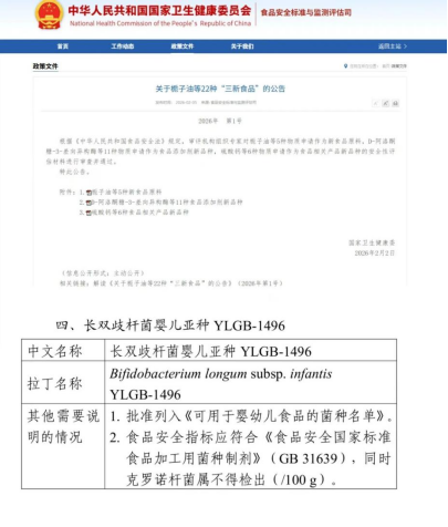 2月5日,国家卫生健康委员会发布公告,正式批准长双歧杆菌婴儿亚种YLGB-1496列入《可用于婴幼儿食品的菌种名单》,标志着YLGB-1496的安全性与功效性经过严格的科学评估和临床验证,将为中国婴幼儿的健康成长提供更加安全、专业、优质的益生菌选择。