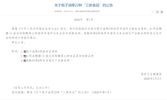 国家卫生健康委食品安全标准与监测评估司于2026年2月5日发布关于栀子油等22种“三新食品”的公告,其中包括5种新食品原料,11种食品添加剂新品种和6种食品相关产品新品种。