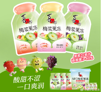 喜之郎上新「NFC梅浆果冻」,将NFC果浆果汁入料,添加量≥40%,口感包含,草莓、水蜜桃、葡萄三种口味,爽滑酸甜,一点都不涩,每种都是不一样的体验!