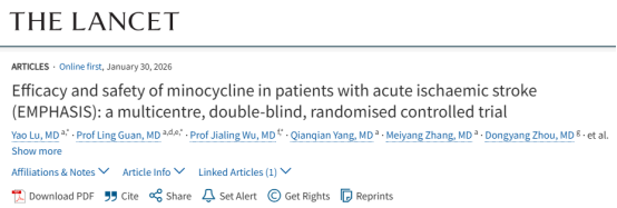首都医科大学附属北京天坛医院王伊龙教授团队在权威期刊《柳叶刀》上发表了一篇题为" Efficacy and safety of minocycline in patients with acute ischaemic stroke (EMPHASIS):a multicentre,double-blind,randomised controlled trial "的三期临床研究。研究证实,在急性缺血性卒中(脑梗)发病72小时内,在常规治疗基础上,联合短期口服米诺环素治疗,可显著改善患者3个月后的功能恢复,且未增加安全性风险。