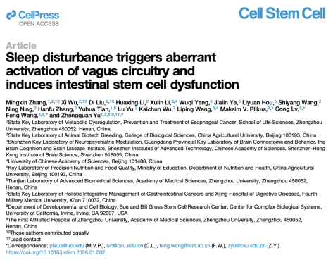 2026 年 2 月 5 日,郑州大学生命科学学院于政权团队联合中国科学院深圳先进技术研究院脑认知与脑疾病研究所王枫团队、中国农业大学吕聪团队以及美国加州大学欧文分校 Maksim V. Plikus 团队(郑州大学张明鑫博士,中国农业大学吴茜博士和博士生刘笛为论文共同第一作者),在 Cell Stem Cell 期刊发表了题为:Sleep disturbance triggers aberrant activation of vagus circuitry and induces intestinal stem cell dysfunction 的研究论文。