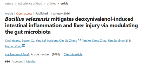 近日,四川师范大学生命科学学院教授、五粮液集团博士后赵甲元在《npj Science of Food》发表题为“Bacillus velezensis mitigates deoxynivalenol-induced intestinal inflammation and liver injury via modulating the gut microbiota”的文章,系统揭示了从五粮液大曲中分离出的Bacillus velezensis WMCC10514菌株能够通过调节肠道菌群与肠-肝轴有效缓解呕吐毒素 (Deoxynivalenol, DON) 诱导的肠道炎症与肝脏损伤,并降低毒素在机体内的蓄积。该研究为开发新型功能性益生菌制剂,保障食品安全和人类动物健康防护提供了创新解决方案。