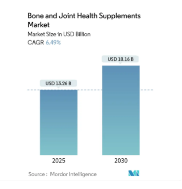 骨骼健康是贯穿人类一生的核心健康命题:儿童期是骨量积累的黄金关键期,孕期与哺乳期关乎母婴双方骨骼代谢平衡,45岁以上新中年阶段迎来骨量流失加速、骨质疏松风险攀升的重要转折点。根据Mordor Intelligence数据,骨骼和关节健康补充剂市场在2025年创造了132.6亿美元的收入,预计将以6.49%的复合年增长率增长,到2030年达到181.6亿美元。亚太地区作为增长最快区域之一,增速预计达8%左右,中国市场增速有望超越全球平均水平。