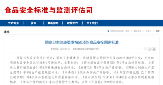 3月27日,国家卫生健康委、国家市场监督管理总局公布了50项食品安全国家标准和9项标准修改单,覆盖乳制品、肉制品、婴幼儿食品等340余个食品类别。