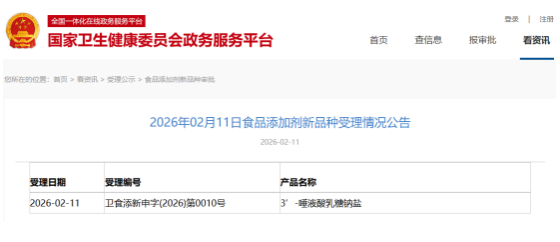根据国家卫生健康委员会政务服务平台发布的公告,近期国家卫健委受理了3’-唾液酸乳糖钠盐食品添加剂新品种的相关申请。