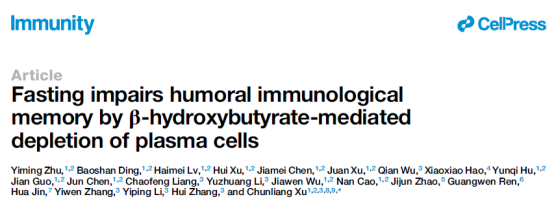 2026年2月23日,中山大学研究团队在"Immunity"期刊上发表了一篇题为"Fasting impairs humoral immunological memory by β-hydroxybutyrate-mediated depletion of plasma cells "的研究论文。这项临床研究证实,轻断食会通过β- 羟基丁酸(BHB)显著耗竭骨髓中长寿浆细胞,进而损害体液免疫记忆,削弱疫苗和自然感染诱导的抗体长期保护效果,造成意想不到的负面影响。