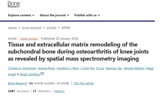 一篇发表在国际杂志Bone Research上题为“Tissue and extracellular matrix remodeling of the subchondral bone during osteoarthritis of knee joints as revealed by spatial mass spectrometry imaging”的研究报告中,来自巴克衰老研究所等机构的科学家们通过研究首次精准捕捉到了这些早期“密报”,研究人员发现,在骨关节炎进程中,软骨下骨的分子重塑发生得比我们想象中更早,甚至在软骨外观尚且完好的时候,骨骼内部已经上演了一场分子“巨变”,这就为我们打开了通过更微创方式实现早期诊断和病情监测的新大门。