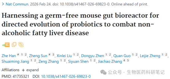 2026年2月24日,国际顶级期刊《Nature Communications》(IF:15.7)在线发表了一项来自中国科研团队的开创性研究。该研究首次提出将无菌小鼠肠道作为体内定向进化平台,成功筛选出可显著改善非酒精性脂肪性肝病(NAFLD)的功能增强型益生菌。