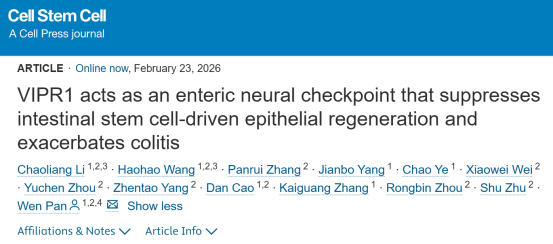 近日,中国科学技术大学潘文团队在Cell Stem Cell(IF=20.4)在线发表题为“VIPR1acts as an enteric neural checkpoint that suppresses intestinal stem cell-driven epithelial regeneration and exacerbates colitis”的研究论文。该研究首次提出了调控肠道上皮修复再生的“神经检查点”机制。研究表明,在炎症性肠病 (IBD) 等慢性炎症中,VIP能神经元通过直接激活干细胞受体VIPR1,抑制上皮再生程序,延缓黏膜愈合并加重炎症进展,确立了神经系统对肠道上皮修复的关键门控作用。