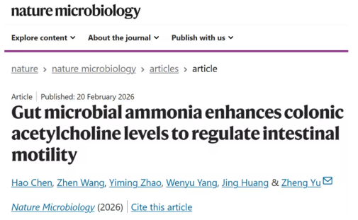 近日,中南大学余正团队在Nature Microbiology(IF=19.4)在线发表题为Gut microbial ammonia enhances colonic acetylcholine levels to regulate intestinal motility的研究论文。该研究表明肠道微生物氨提高结肠乙酰胆碱水平以调节肠道运动。