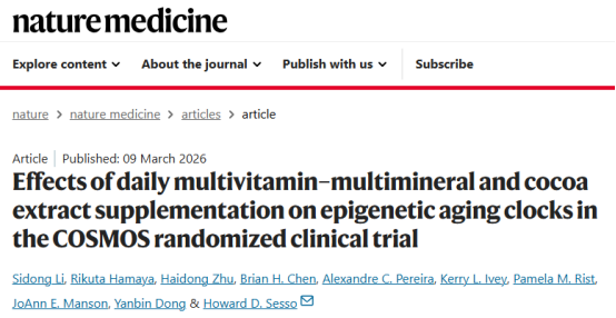 2026年3月9日,布莱根妇女医院、哈佛医学院研究人员在顶级医学期刊"Nature Medicine"上发表了一篇题为"Effects of daily multivitamin-multimineral and cocoa extract supplementation on epigenetic aging clocks in the COSMOS randomized clinical trial"的研究论文。