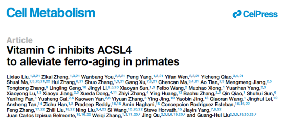 2026年3月11日,刘光慧、曲静、张维绮等研究人员在"Cell Metabolism"期刊上发表了一篇题为"Vitamin C inhibits ACSL4 to alleviate ferro-aging in primates"的研究论文。