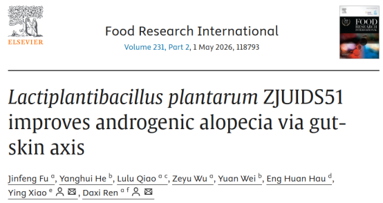 浙江大学动物科学学院任大喜教授和浙江大学医学院附属邵逸夫医院肖瑛团队在国际食品期刊《Food Research International 》发表题目为“Lactiplantibacillus plantarum ZJUIDS51 improves androgenic alopecia via gut-skin axis”的研究性论文。本文第一作者为傅金凤,通讯作者为肖瑛和任大喜。文章结合了动物模型实验、16S rRNA基因测序以及非靶向代谢组学分析,全面评估了植物乳植杆菌Z.JUIDS51(Z51)通过肠-皮轴缓解雄激素性脱发(AGA)的功效与潜在机制。研究表明,Z51通过调节肠道微生物群落(特别是影响雄激素和炎症相关的菌株丰度)重塑了肠道微环境,为未来AGA的靶向治疗和功能性益生菌的开发提供了新的科学依据 。