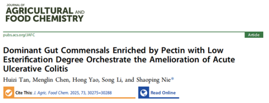 果胶作为应用最广泛的膳食纤维之一,其对结肠炎的缓解作用是如何实现的?南昌大学聂少平教授团队在国际期刊“Journal of Agricultural and Food Chemistry”发表了题为"Dominant Gut Commensals Enriched by Pectin with Low Esterification Degree Orchestrate the Amelioration of Acute Ulcerative Colitis”的文章,阐述了果胶基于菌群调节缓解结肠炎的作用机制,为利用低酯果胶及其衍生的菌群组合来开发创新性IBD疗法提供理论依据。