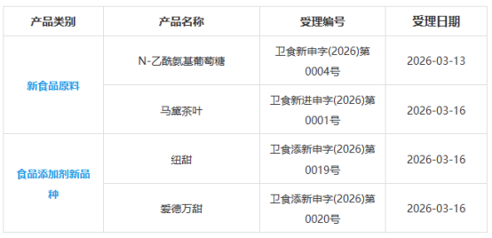 国家卫生健康委员会政务服务平台近期发布受理公告,其中新食品原料-新增受理2种:N-乙酰氨基葡萄糖、马黛茶叶;食品添加剂新品种-新增受理2种:纽甜、爱德万甜。