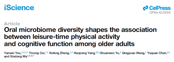 近日,清华大学、新加坡国立大学、北京协和医学院等科研人员在 Cell Press 旗下期刊"iScience"上发表了一篇题为"Oral microbiome diversity shapes the association between leisure-time physical activity and cognitive function among older adults"的研究论文。