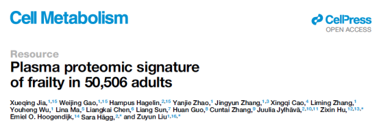 2026年3月16日,浙江大学、复旦大学、卡罗林斯卡学院的研究团队在"Cell Metabolism"期刊上发表了一篇题为"Plasma proteomic signature of frailty in 50506 adults"的研究论文。这项研究绘制了迄今最全面的人体衰弱血浆蛋白质组图谱,并开发出能够精准199种疾病的蛋白质组衰弱评分,为衰弱的早期识别、精准干预提供了有力工具。