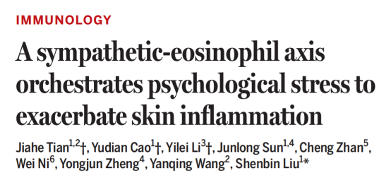 该研究于2026年3月 19日发表于国际顶尖学术期刊Science,论文题为:A sympathetic-eosinophil axis orchestrates psychological stress to exacerbate skin inflammation,复旦大学脑科学研究院柳申滨研究员为论文通讯作者,复旦大学脑科学研究院博士生田嘉禾、曹与点,复旦大学附属中山医院李一雷医生为论文共同第一作者。