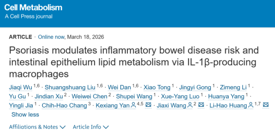 2026年3月18日,复旦大学黄立豪、王嘉希、颜克香共同通讯在Cell Metabolism(IF=30.9)在线发表题为“Psoriasis modulates inflammatory bowel disease risk and intestinal epithelium lipid metabolism via IL-1β-producing macrophages”的研究论文。该研究发现银屑病通过产生IL-1β的巨噬细胞调节炎症性肠病风险和肠上皮脂质代谢。该研究揭示了人类银屑病严重程度和餐后APOB48水平之间的反比关系。使用新开发的光转化APOB敲入小鼠和肠道类器官,表明产生IL-1β的巨噬细胞驱动APOB降解和上皮脂质积累,这揭示了银屑病和肠道炎症共病之间的新联系。
