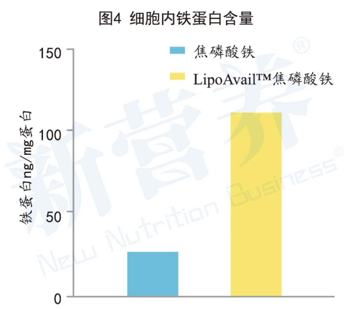 就铁元素而言,它是人体必需的微量元素,但传统铁剂却因吸收效率低、感官体验差、稳定性不足三大痛点,始终难以满足消费者与品牌方的需求。音芙医药将LipoAvail™脂质体技术用于铁化合物包封,针对不同铁源的特性进行定制化改造,形成覆盖粉末、液体两大形态的脂质体铁原料体系。经CaCo-2细胞实验验证,以细胞内铁蛋白含量为检测指标,摄取LipoAvail™脂质体焦磷酸铁的细胞,其铁蛋白含量是摄取普通焦磷酸铁细胞的4.3倍,显著提升铁元素的细胞吸收效率。