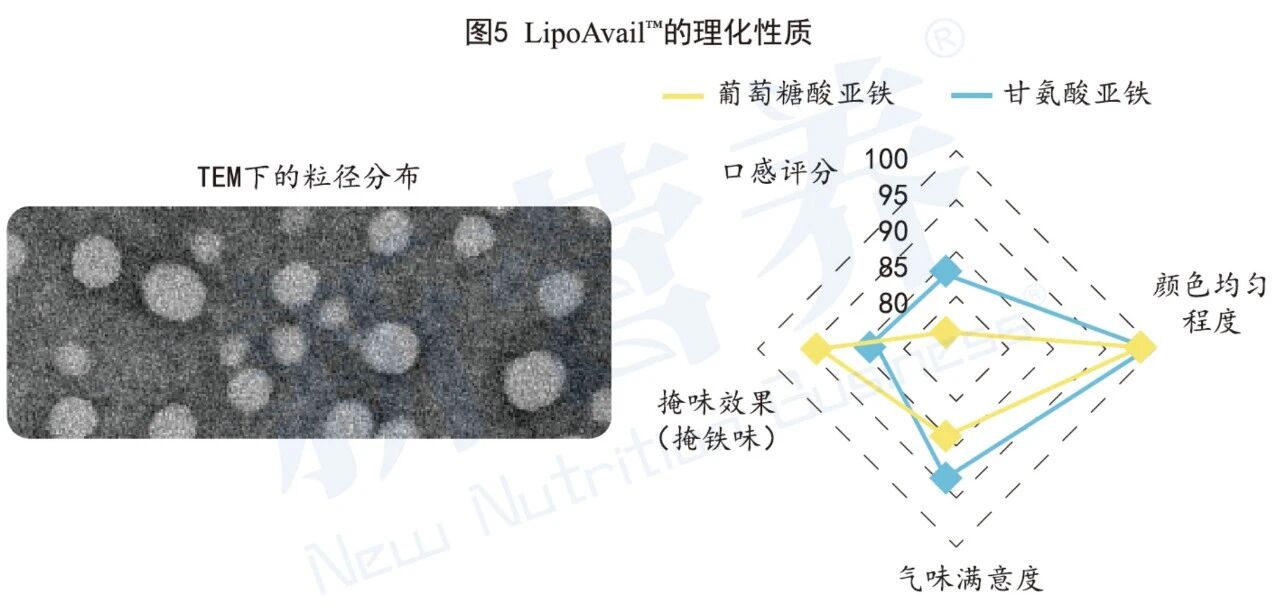 LipoAvail™脂质体铁具备卓越的理化性质,铁化合物含量为50%、70%,呈规则的球形形状,平均粒径仅20nm。包封后的铁化合物在储存与消化道中不易被氧化,稳定性得到大幅提升,分散性也得到了一定程度的改善。更值得一提的是,LipoAvail™脂质体铁实现了补铁剂的感官突破,经专业感官评测,LipoAvail™液体脂质体铁的掩味效果≥88%,气味满意度≥89%,口感评分达82-88分,颜色均匀度更是达到99.5%,液体剂型几乎无沉淀、无分层,全方位提升用户体验。