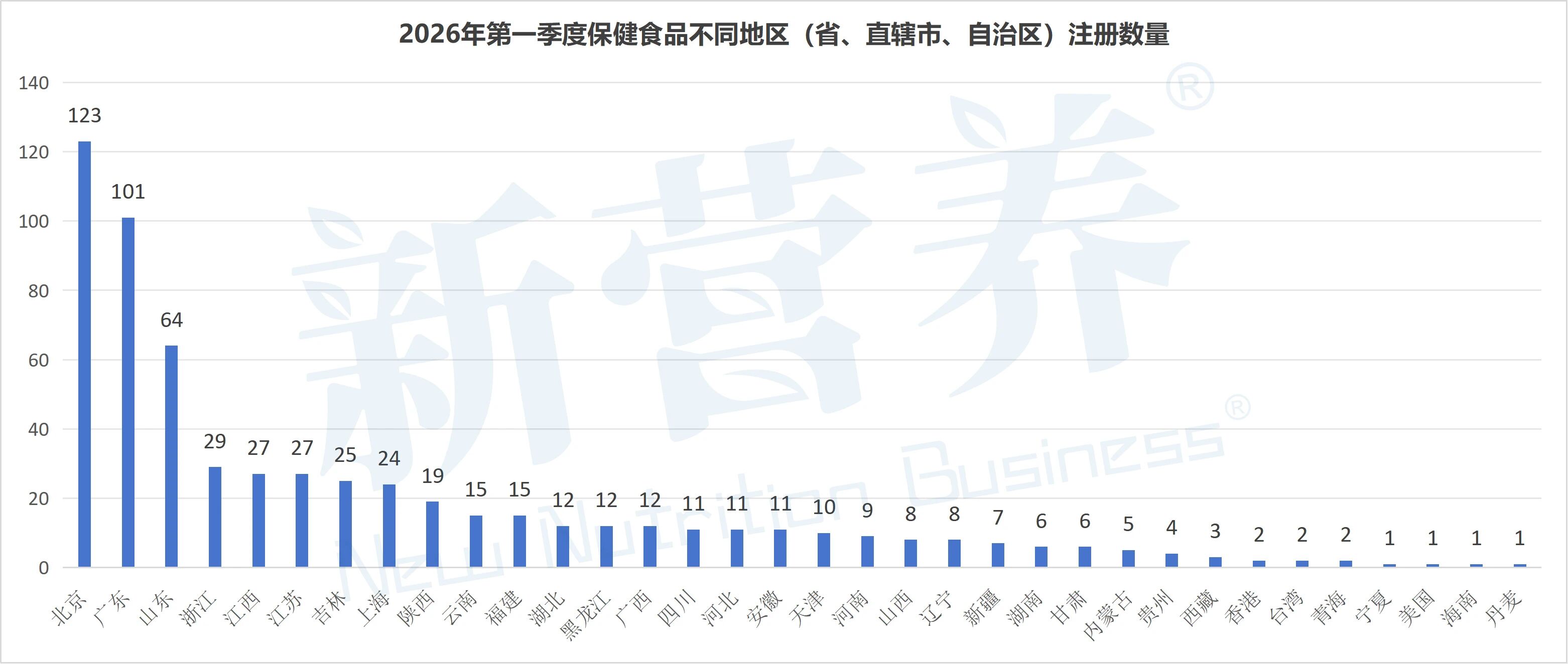 2026年第一季度,我国保健食品注册呈现明显的区域差异,头部省市领跑格局突出。北京以123个获批数量位居全国首位,依托政策、科研与产业资源优势,稳居行业核心地位;广东以101个紧随其后,彰显华南保健食品大省的强劲研发与申报实力;山东以64个位列第三,华东产业基础与市场需求为其提供有力支撑。