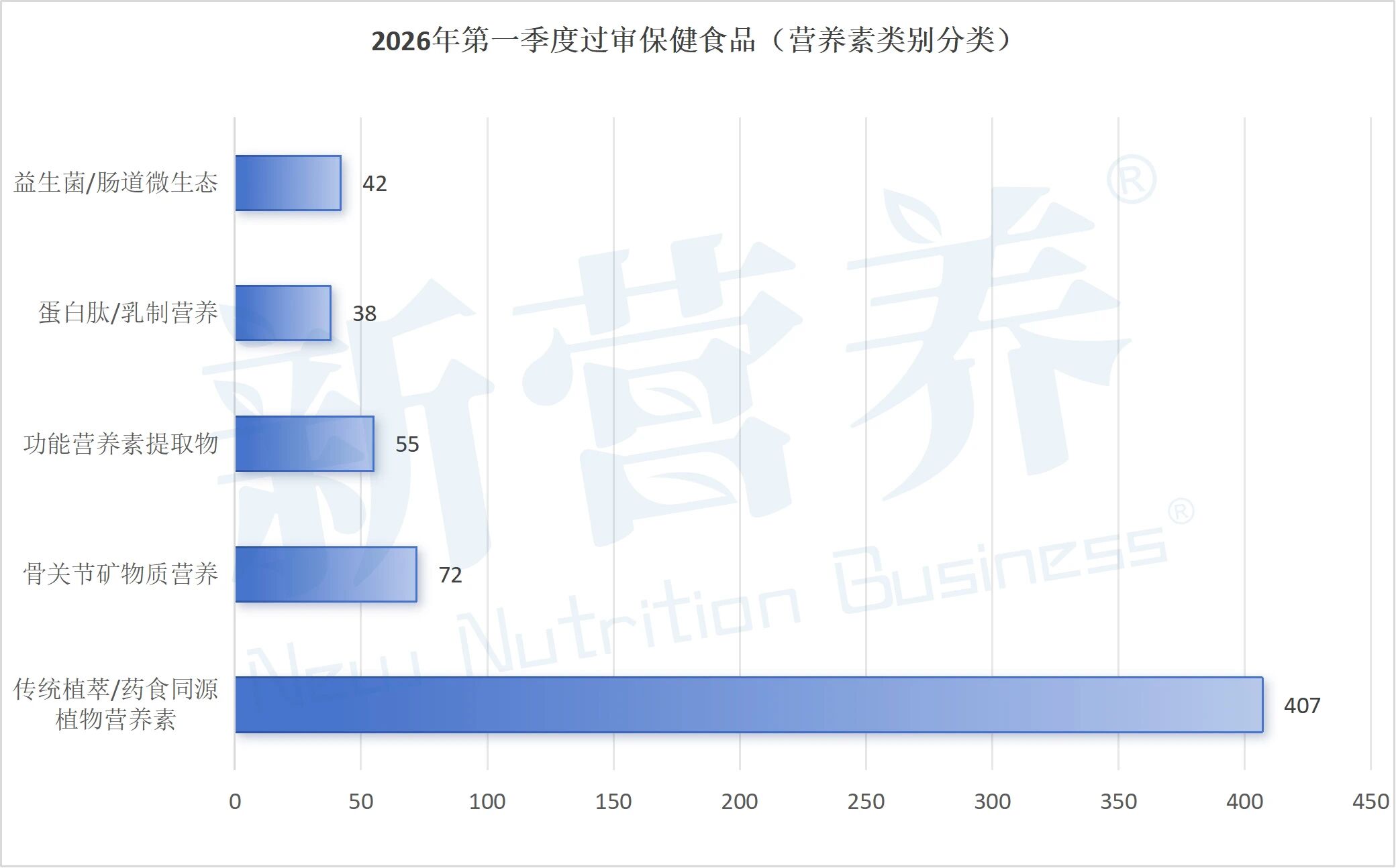从2026年第一季度保健食品过审数据来看,药食同源赛道的主导地位已全面确立。在营养素类别分布中,传统植萃/药食同源植物营养素以407个的过审数量遥遥领先,占本季度过审总量的绝对主体,远超骨关节矿物质营养(72个)、功能营养素提取物(55个)等其他品类,成为行业申报与创新的绝对主流。