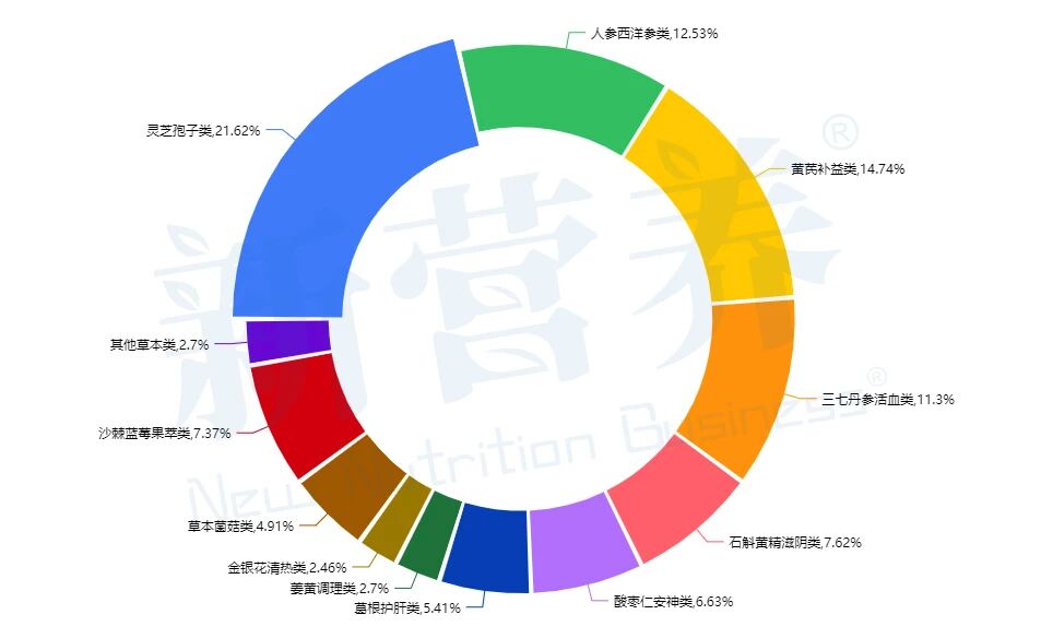 三七丹参活血类(11.3%)、石斛黄精滋阴类(7.62%)、酸枣仁安神类(6.63%)、沙棘蓝莓果类(7.37%)等品类也实现了稳定过审,精准匹配了心血管养护、滋阴调理、助眠、护眼等多元消费需求。葛根护肝类、草本菌菇类、金银花清热类等细分原料同样占据一定份额,进一步丰富了产品矩阵。