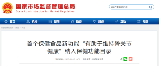 2026年1月16日:市场监管总局发布《允许保健食品声称的保健功能目录有助于维持骨关节健康(缓解疼痛或僵硬/缓解软骨损伤)》。