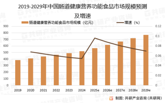 图:2019-2029年中国肠道健康营养功能食品市场规模预测及增速