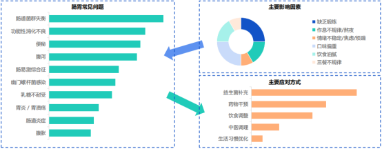 从消费者需求端来看,胃肠道问题的诱因呈现复杂多样的特征,多由饮食习惯、生活方式和情绪问题等多种因素共同作用引发,其中饮食不规律、作息紊乱、情绪压力大等成为主要影响因素,肠道菌群失衡、消化不良、便秘、腹泻等问题也成为社交媒体上大众关注度最高的肠道健康困扰。