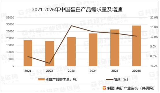 从国内市场需求端来看,蛋白产品的消费增长势能持续释放,与全民抗衰、健康升级的趋势深度共振。共研产业咨询数据显示,2021-2026年中国蛋白产品需求量呈现持续攀升态势,尽管增速有所波动,但整体需求规模稳步扩容,2026年预计需求量将突破29000吨,较2021年实现近60%的增长。