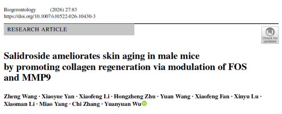 红景天苷(Salidroside),是红景天中的糖苷类化合物,已被证实具有抗炎、抗氧化、抗光老化等作用。南京中医药大学团队在"Biogerontology"期刊上发表了一篇题为"Salidroside ameliorates skin aging in male mice by promoting collagen regeneration via modulation of FOS and MMP9"的研究论文。