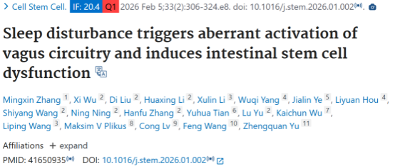 一项郑州大学发表在《Cell Stem Cell》上的研究:Sleep disturbance triggers aberrant activation of vagus circuitry and induces intestinal stem cell dysfunction,即睡眠障碍触发迷走神经回路的异常激活,并导致肠道干细胞功能障碍。本研究发现,急性睡眠剥夺会损害肠道干细胞功能,导致隐窝-绒毛结构缩短及潘氏细胞缺失。该研究揭示了调控肠道干细胞的睡眠剥夺响应性神经回路,并提出了缓解睡眠剥夺相关肠道疾病的治疗策略。