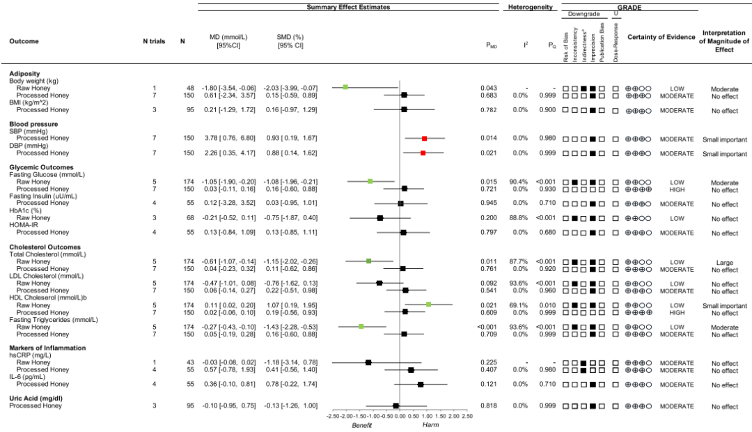 在该研究中,研究人员对蜂蜜的临床试验进行了荟萃分析,共纳入18项对照试验和1105名参与者,分析了蜂蜜对心脏代谢危险因素的影响,包括肥胖、血糖控制、血脂、血压、尿酸、炎症标志物等。