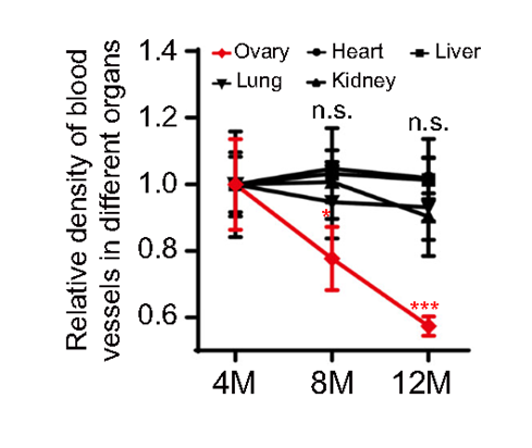 通过荧光3D呈像技术,不同年龄段(4个月/8个月/12个月)的小鼠卵巢血管分布情况直观的展现在人们眼前(图1)。随着年龄的增加,卵巢血管逐渐衰老退化,而且退化速度远快于其他器官(图2)。