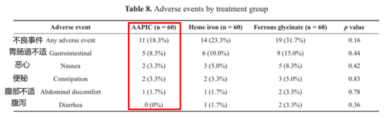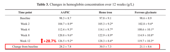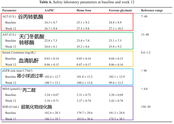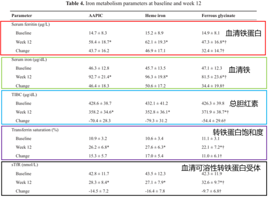 研究结果表明:3-4h 后,Auricul-F®黑木耳多糖铁的吸收率达23.7%,高于甘氨酸亚铁,接近血红素铁。血红蛋白水平达到126.5g/L,恢复到正常水平(成年女性标准≥110g/L),提高了28.7%。同时血清铁蛋白、血清铁、总胆红素、转铁蛋白饱和度和转铁蛋白受体等铁代谢指标也显著改善。重要的是,在安全性和不良反应方面,Auricul-F®黑木耳多糖铁完胜甘氨酸亚铁和血红素铁[7]。
