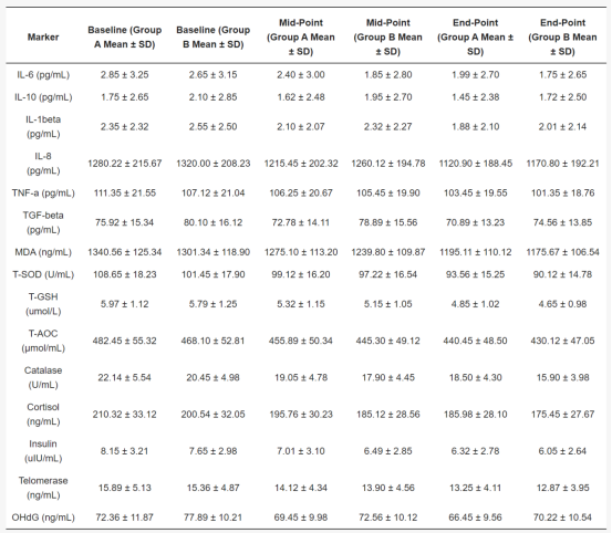 具体而言,A组(生育三烯酚组)在心理健康质量(QOL-Psychological)方面表现出显著改善,表明生育三烯酚补充对心理健康具有积极作用。此外,A组在多个抗氧化指标(如TNF-α、T-SOD、过氧化氢酶等)上也表现出有利趋势,提示生育三烯酚能够改善氧化应激状态和基因稳定性。特别是在端粒酶水平的改善方面,A组表现出了更为显著的效果,表明生育三烯酚有助于维护端粒长度,延缓细胞衰老。总的来说,该研究为生育三烯酚在老年人健康干预中的潜力提供了有力的证据。