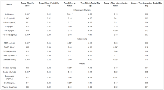 跨组和时间点的炎症、抗氧化剂和其他生物标志物的统计分析