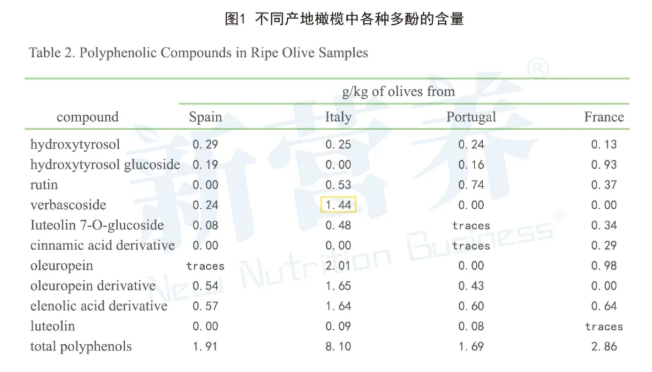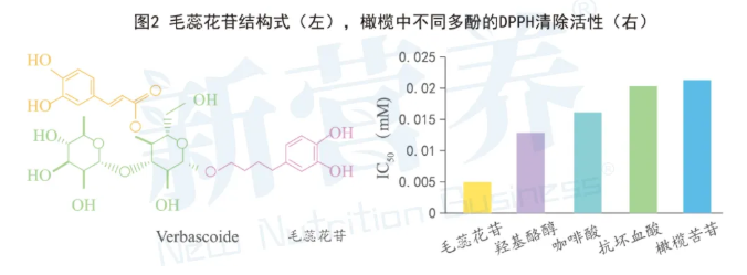 来自意大利南部地区普利亚区的科拉蒂纳橄榄就是一种特有的橄榄品种,被用来生产优质的橄榄油。研究发现,它的橄榄果肉中更蕴含一种“宝藏成分”——毛蕊花苷。实验证明,毛蕊花苷的抗氧化活性是橄榄苦甙的5倍,也是橄榄全植株抗氧化能力最强的活性成分(毛蕊花苷>羟基酪醇>橄榄苦甙)。(见图2)