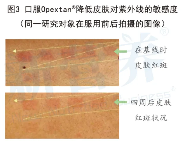 临床研究表明,口服Opextan®橄榄果提取物可红斑剂量显著增加14.5%(p<0.01),同时紫外线暴露耐受时间显著增加14.1%(p<0.01),因此Opextan®橄榄果提取物能显著提升皮肤对紫外线的耐受阈值,降低敏感度,帮助肌肤主动抵御全波段急性紫外线损伤。(见图3)