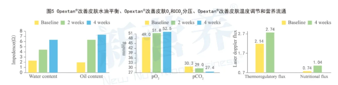 实验结果表明,使用Opextan®的女性,其皮肤含水量和含油量逐步增加,皮肤水合作用增强,脱落现象减少,氧分压升高、二氧化碳分压降低,皮肤体温调节功能和营养流量也得到优化,并且优于对照组观察到的结果。这也证明了Opextan®橄榄果提取物或可修复皮肤屏障、提高皮肤恢复能力,以及影响皮肤微循环,进而助力构建更健康的皮肤肌底。(见图5)