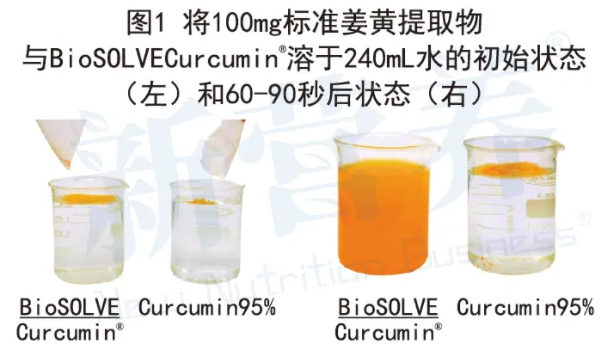 得益于独家专利技术,BioSOLVECurcumin®在水中的分散性显著提升,突破了传统姜黄提取物的脂溶局限,可轻松溶于水、果汁或奶昔等水性环境中,形成均匀稳定的溶液,无沉淀、易吸收。这一特性大大拓宽了姜黄提取物的应用可能性,使其可灵活应用于胶囊、片剂、软糖、固体饮料、液态饮料等多种剂型中,满足不同的市场产品剂型偏好。(见图1)