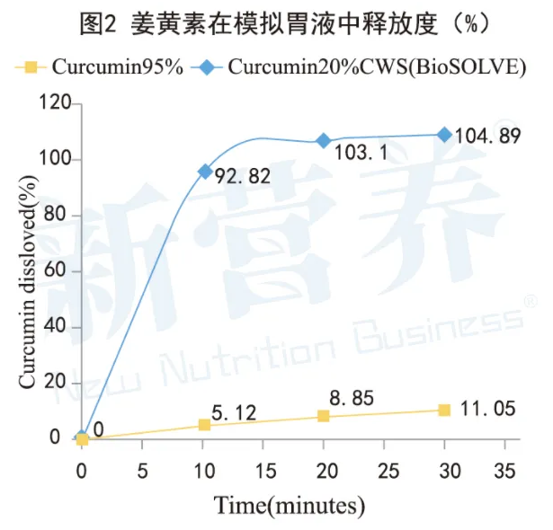 此外,在模拟人体胃液环境的溶解性对比试验中,BioSOLVECurcumin®表现出色:在10分钟内姜黄素释放率超过90%,而标准姜黄提取物在相同条件下仅达到5%。该结果初步说明,BioSOLVECurcumin®具备更快的溶解速度和更优的释放特性,为其在人体内的高效吸收奠定了基础。(见图2)