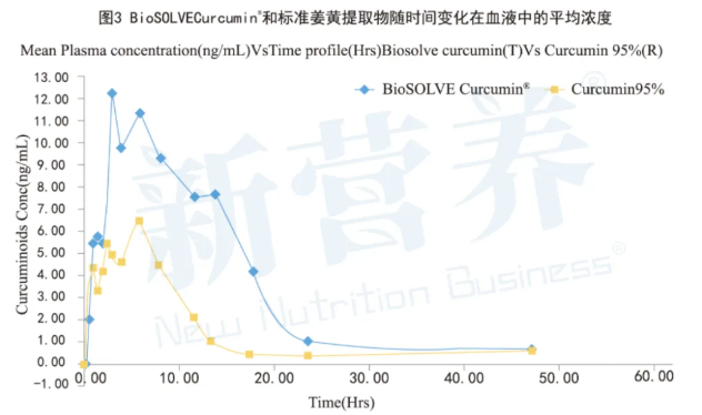 除了在模拟消化模型中的良好表现外,一项在健康人群中开展的随机、开放标签、交叉对照临床研究进一步证实了BioSOLVECurcumin®在实际人体中的吸收优势。该研究比较了单次服用500mg BioSOLVECurcumin®与1000mg标准姜黄素提取物(含95%姜黄素)后的血液中姜黄素浓度变化。结果表明,BioSOLVECurcumin®的吸收效率达到标准姜黄素提取物的48倍。凭借这一显著提高的生物利用度,BioSOLVECurcumin®能够以更低的剂量实现更好的吸收效果,为产品配方设计提供更宽窗口,并在维持功效的同时能够潜在优化成本,向市场提供一种更具效益的解决方案。(见图3)