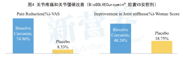 一项针对类风湿关节炎受试者(RA功能为二级)的临床研究显示,每天服用500mg BioSOLVECurcumin®,30天后临床效果便具有显著性,受试者在关节疼痛、肿胀、僵硬以及关节活动能力方面都得到明显改善。其中,关节疼痛的可视化量表评分下降了74.96%,90%受试者从重度疼痛改善至轻度或中度疼痛;骨关节炎指数(WOMAC)中骨关节僵硬的评分也显著改善48.42%,活动能力得到明显改善,且没有报告严重不良反应,同时证实了BioSOLVECurcumin®中被高效吸收的姜黄素确实产生了预期的抗炎和止痛的临床效果。(见图4)