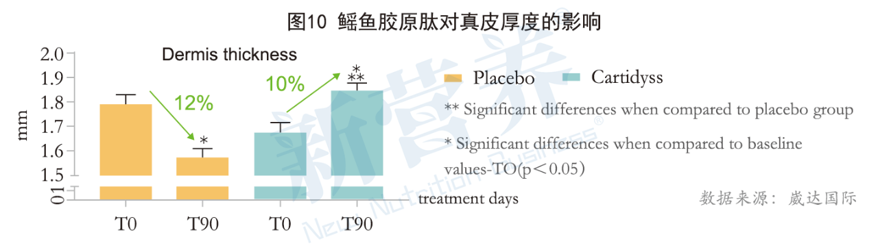 测量真皮层的厚度,与基准线相比,鳐鱼肽Cartidyss®显著增加真皮厚度10%;与安慰剂组对比,鳐鱼肽Cartidyss®显著增加真皮厚度22%。真皮厚度与水合作用相关,鳐鱼肽Cartidyss®可增加皮肤的水合作用。