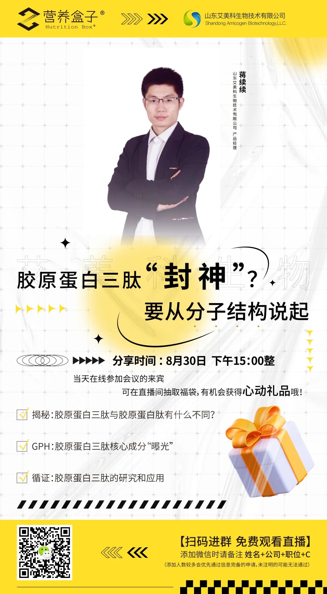 想要了解更多艾美科生物胶原蛋白三肽的作用机制及科学应用,请关注8月30日15:00由新营养和艾美科生物带来的在线会议【胶原蛋白三肽“封神”?要从分子结构说起】,期待与大家一起讨论,相关话题如下: