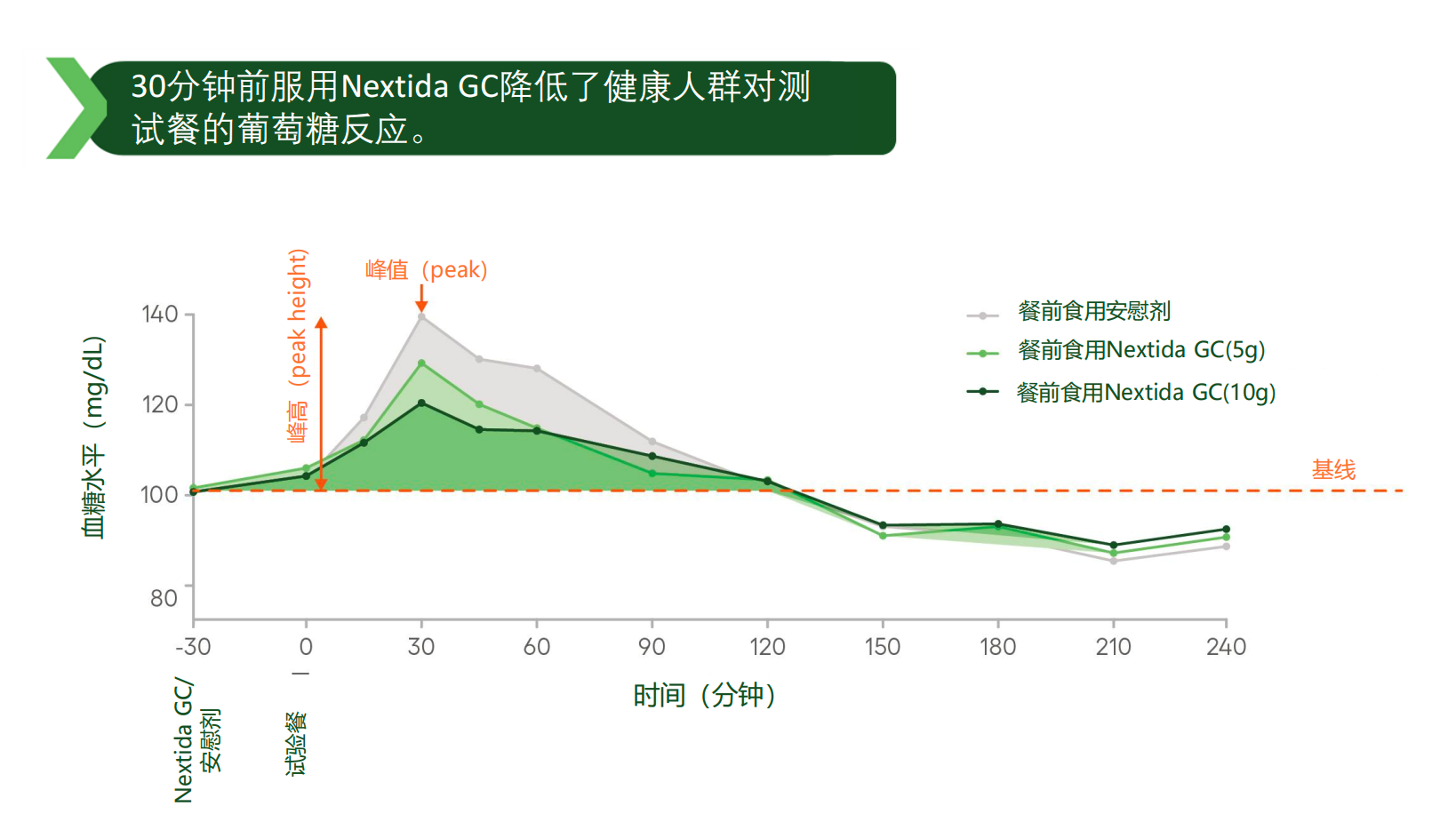 一项随机双盲安慰剂交叉对照临床实验显示,与安慰剂组相比,饭前30分钟食用5g与10g Nextida·GC实验组的受试者均对餐后血糖的急性葡萄糖反应产生了积极影响。该影响包括平稳餐后血糖峰值及整体升糖量、积极影响糖代谢、减少人体对糖的摄入等[1]。