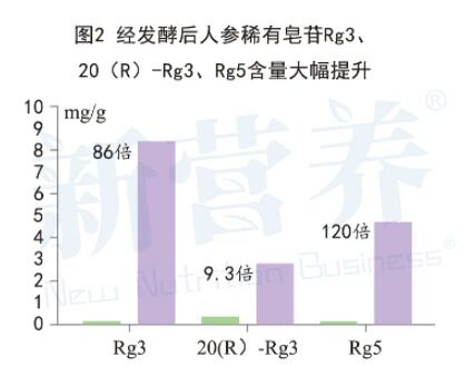 原型人参皂苷在肝脏内基本不代谢,主要在肠道中降解,然而原型人参皂苷口服后很难被肠道直接吸收,仅有3-5种人参皂苷能够以原形的形式进入血液,生物利用度仅为1%。因此原型人参皂苷必须经过代谢转化成分子结构更小的稀有皂苷,才能快速透过细胞面膜进入血液发挥生物活性。但稀有皂苷含量及其稀少,且无法从人参中直接提取。为了攻克吸收转化的限制,借助微生物发酵的力量倍增关键成分。监测结果表明,发酵人参稀有皂苷含量远高于人参。(见图2)稀有